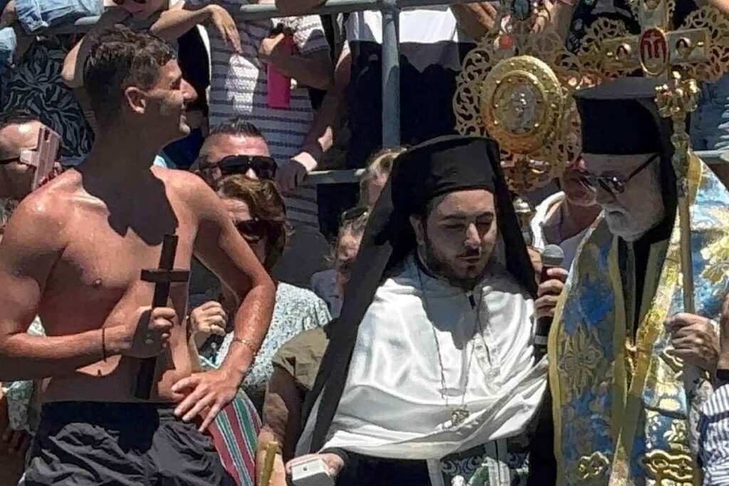 Μπροστά στα βλέμματα οικογενειών και υποστηρικτών που είχαν συγκεντρωθεί κατά μήκος της προβλήτας, ο 18χρονος Κώστας Κοπσαφτής ανέσυρε τον Τίμιο Σταυρό, λαμβάνοντας την τιμητική διάκριση που απονέμεται παραδοσιακά στον επιτυχή δύτη.