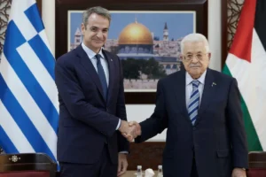 Greek Prime Minister Kyriakos Mitsotakis met with Palestinian Authority President Mahmoud Abbas on Monday in Ramallah, ahead of his visit to Jerusalem and participation in the Greece–Cyprus–Israel trilateral summit. Support for the Palestinian Authority and humanitarian aid Mitsotakis reiterated Greece’s support for the Palestinian Authority as the sole legitimate representative
